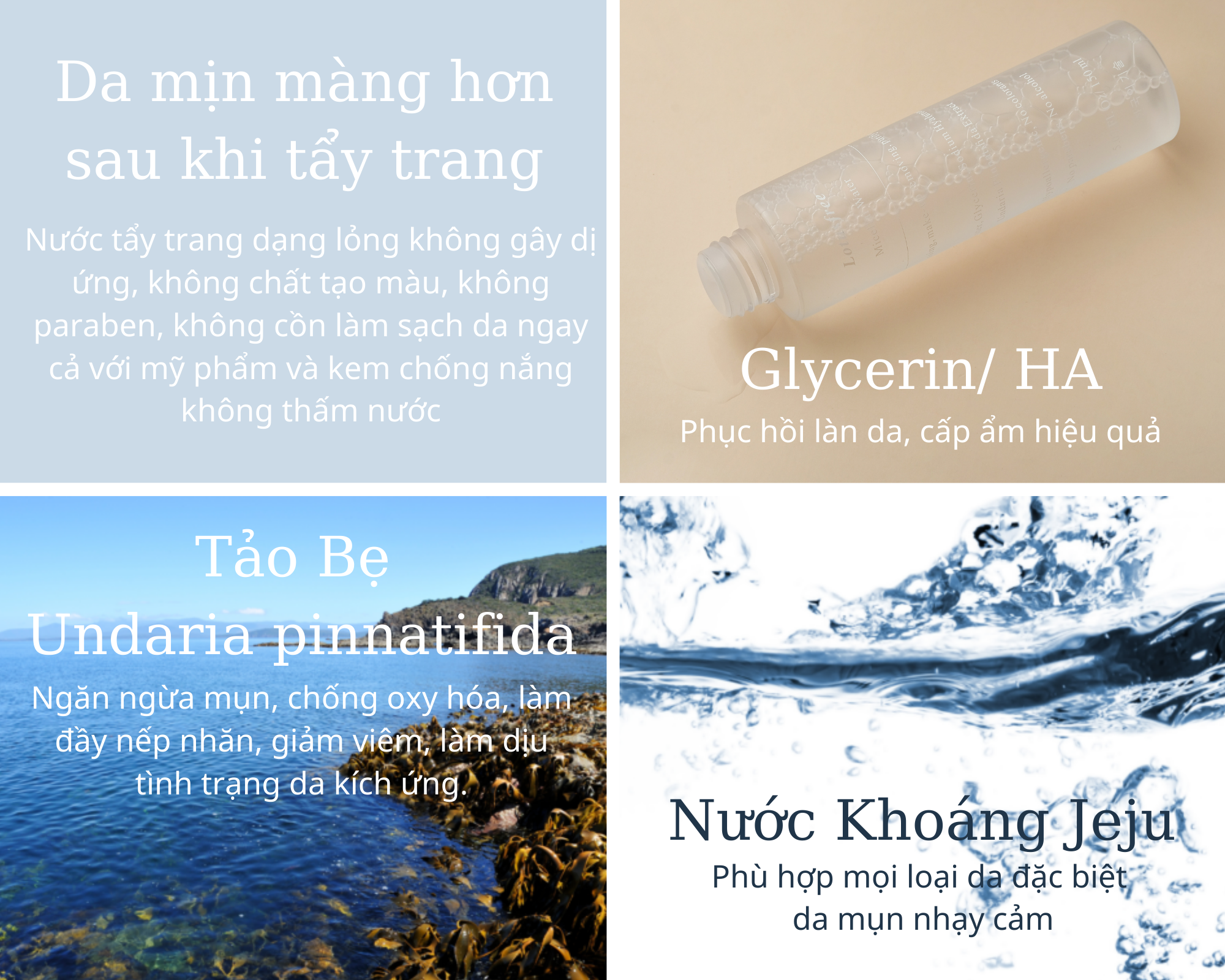 Công dụng: Tẩy trang, dưỡng ẩm da, giúp ngăn ngừa mụn, giúp làm sạch lớp trang điểm, bụi bẩn, dầu thừa trên da.