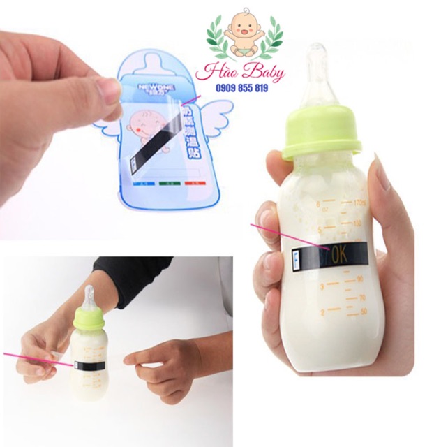 Miếng dán đo nhiệt độ bình sữa cho bé Trẻ em không chịu được nhiệt độ quá cao cũng như nhiệt độ quá thấp, nhất là trẻ vừa sinh, vì trẻ rất non nớt, cơ thể trẻ chưa thích ứng tốt được với môi trường tự nhiên, không chịu được nóng cũng không chịu được lạnh. Mọi thứ cho trẻ ăn uống, sử dụng đều phải ở một nhiệt độ vừa phải để không làm tổn thương tới trẻ Các mẹ khi chăm con luôn không chắc chắn được rằng nhiệt độ bình sữa mình pha cho con đã ổn chưa, có bị nóng hay nguội quá không? Nhiệt kế đo nhiệt độ bình sữa sẽ giải quyết nỗi lo này khi cho biết chính xác nhiệt độ nước ở ngưỡng nào vừa với bé, để bé khi bú bình không bị nóng quá hoặc lạnh quá. Miếng dán đo nhiệt độ bình sữa cho bé trước khi bé uống, các mẹ sẽ biết ở nhiệt độ nào là vừa, đảm bảo mọi thứ an toàn và tốt cho sự phát triển của bé Hướng dẫn khi sử dụng miếng dán đo nhiệt: -Thước đo nhiệt độ bình sữa thực chất là một miếng nhiệt kế dán đo nhiệt độ, hiển thị thông báo cho người dung các mức nhiệt khác nhau. Căn cứ vào kết quả đó để điều chỉnh pha nước có nhiệt độ vừa đúng tiêu chuẩn, bé không phải uống sữa quá bỏng hoặc sữa bị nguội. -Miếng dán đo nhiệt độ bình sữa có 4 mức nhiệt được chia làm 4 màu: Xanh than: nhiệt độ quá thấp Vàng cam: nhiệt độ thấp Xanh da trời: nhiệt độ thích hợp (Khi nhiệt độ bình sữa đạt mức nhiệt độ tiêu chuẩn là 40 độ C, trên vạch đo nhiệt độ của miếng dán sẽ hiển thị chữ OK). Xanh lục: nhiệt độ cao Lưu ý khi sử dụng miếng dán đo nhiệt: - Sau mỗi lần dùng nhiệt kế xong phải bỏ ra khỏi bình, chỉ khi nào cần kiểm tra nhiệt độ bình sữa mới dán. Không để nguyên nhiệt kế trên bình lúc rửa và làm sạch khử trùng bình. -Ngoài ra các mẹ nên lưu ý giữ miếng nhiệt kế nơi sạch sẽ không bụi bẩn, nếu bị dính bụi bẩn trong mặt dán khiến nhiệt kế không bám vào thân bình thì có thể dùng khăn ướt lau qua rồi để khô là lại sử dụng được. -Không để miếng dán nhiệt kế ở nơi có ánh sang mặt trời hoặc để trong tủ lạnh, vì bộ phận cảm ứng của nhiệt kế sẽ bị tác động bởi nhiệt độ quá nóng của mặt trời và hơi lạnh trong tủ lạnh sẽ nhanh hỏng. -Không nên cho trẻ nghịch nhiệt kế, để xa tầm với tay của trẻ