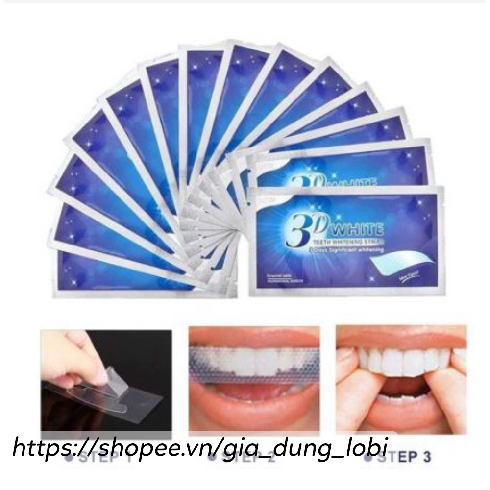 - Miếng dán trắng răng 3D WHITE Teeth Whitening strips thuộc dòng sản phẩm DENTAL WHITENING KIT 3D đem đến cho bạn nụ cười trắng sáng rạng ngời chỉ sau 14 ngày sử dụng. Sức mạnh làm trắng của 3D WHITE Teeth Whitening strips mạnh gấp 25 lần các loại kem đánh răng làm trắng răng hàng đầu hiện nay. Bạn sẽ nhận thấy hiệu quả rõ rệt chỉ sau 3 lần sử dụng đầu tiên.