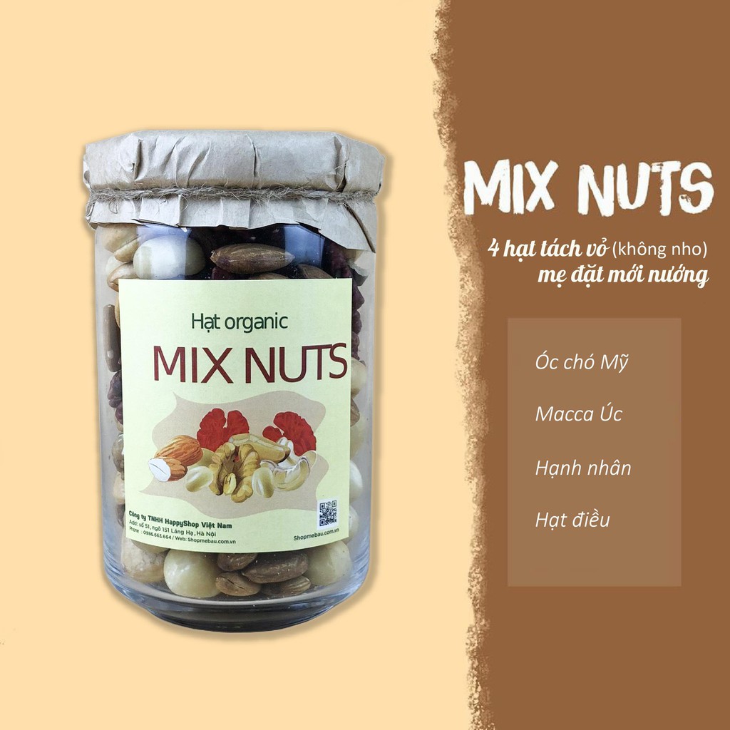 Hũ mix gồm: - 25% Macca Úc - 25% Óc chó Hartley Mỹ - 25% Hạnh nhân Mỹ - 25% Hạt điều HSD: mẻ nướng mới mỗi ngày.