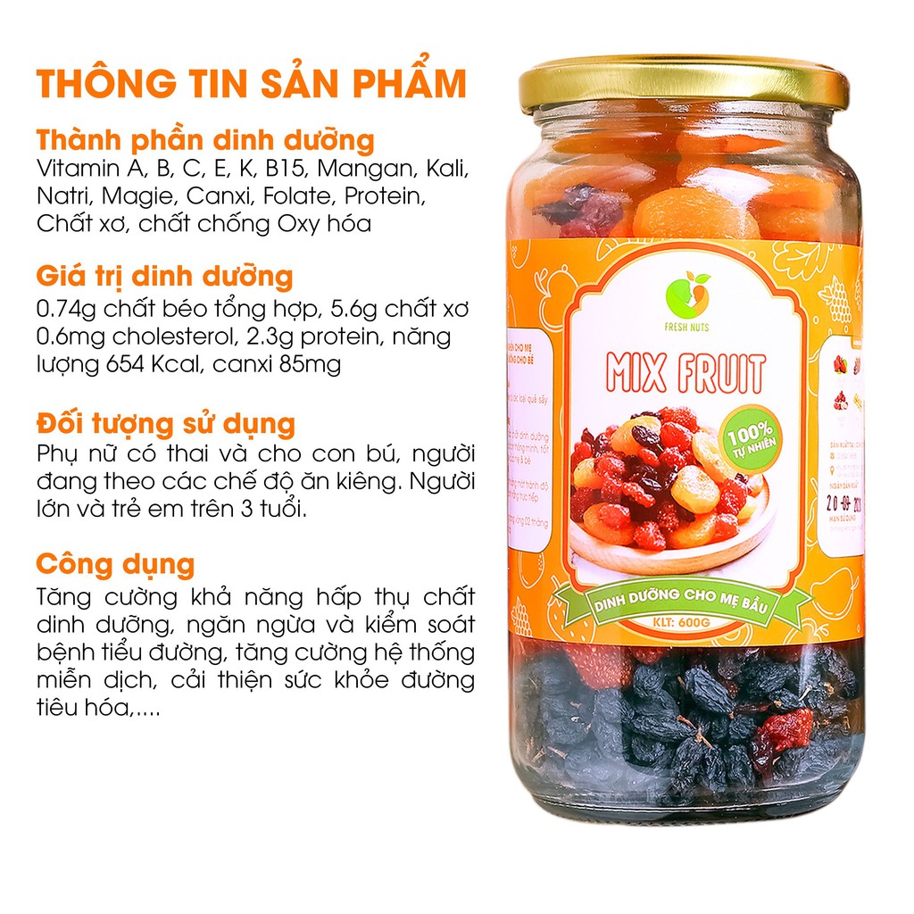 THÔNG TIN SẢN PHẨM - Thành phần: Mix 4 loại quả gồm Mơ sấy dẻo, Nam Việt quất sấy dẻo, Dâu tây sấy dẻo và Nho đen - Đối tượng sử dụng: phụ nữ mang thai có nhu cầu giảm nghén, bổ sung dinh dưỡng, ăn ngon. Người ăn kiêng, ăn lành mạnh healthy. Người giảm cân, keto, low carb - Thành phần dinh dưỡng: Vitamin B, C, E, D, K, B15, Mangan, Kali, Natri, Magie, Canxi, Folate, Protein, Chất xơ, Chất chống Oxy hóa. - Giá trị dinh dưỡng: 5.6g chất xơ, 2.3g Protein, 0.74g chất béo tổng hợp, năng lượng 654Kcal, canxi 85mg - Hướng dẫn sử dụng: Dùng ngay không qua chế biến. - Bảo quản: Nơi khô thoáng, tránh ánh nắng trực tiếp. - Hạn sử dụng: 6 Tháng (sử dụng trong 30 ngày từ khi mở nắp sản phẩm trải nghiệm hương vị tốt nhất)