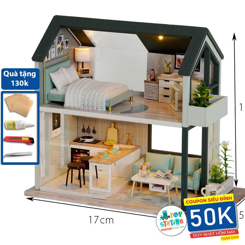 Mẹ & Bé > Đồ chơi > Búp bê & Thú nhồi bông > Nhà búp bê & Phụ kiện || Mô hình Nhà búp bê DIY Dollhouse lắp ghép bằng gỗ có đèn Led, mẫu Peaceful Time Tặng kèm Mica che bụi, và dụng cụ lắp