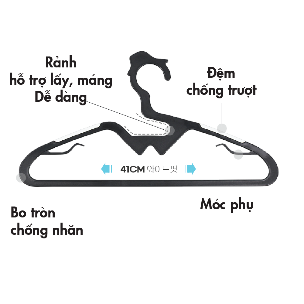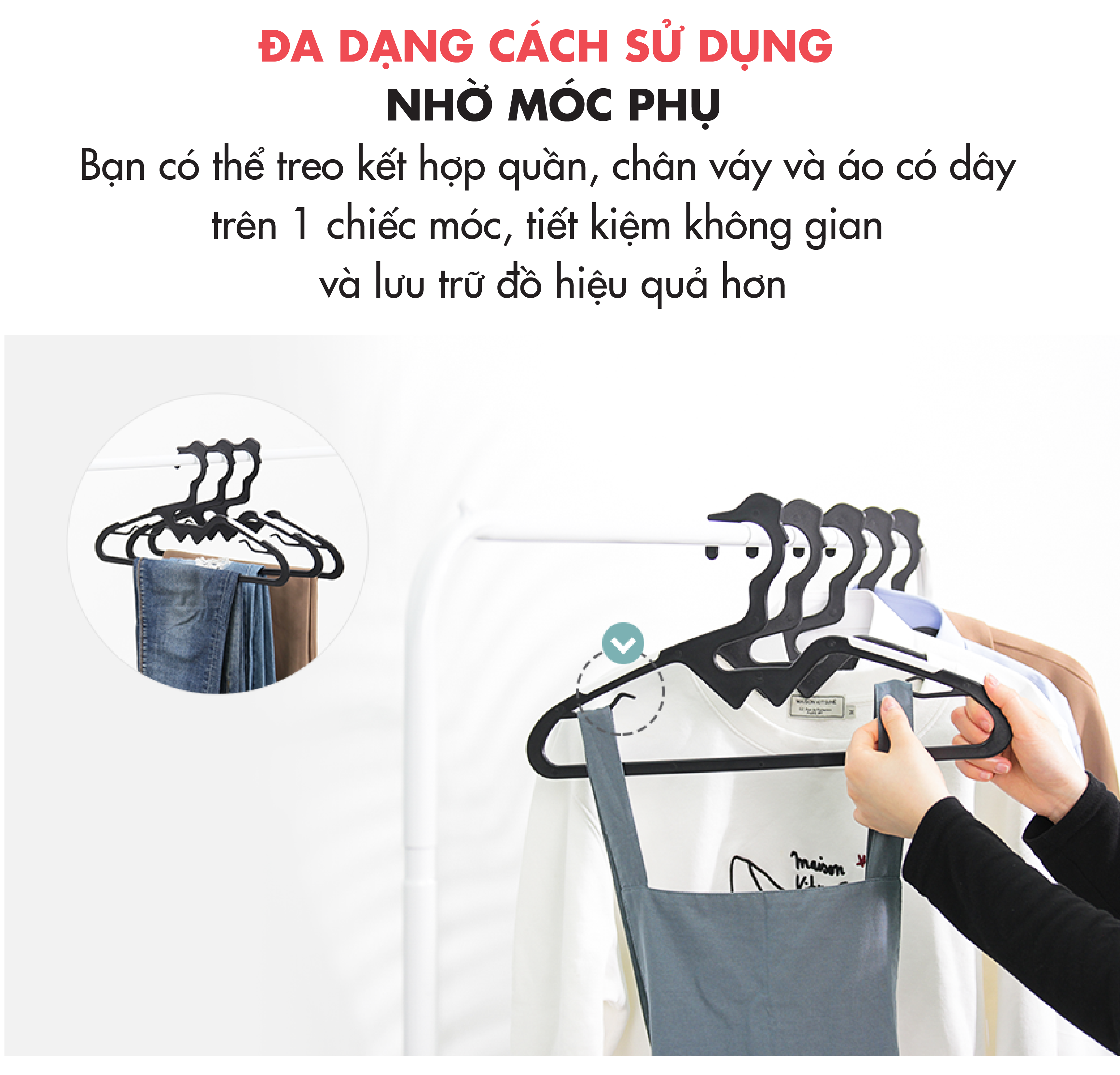 - Thiết kế hiện đại nâng cao sự tiện lợi khi sử dụng nhựa PP , phần đầu móc có thể tận dụng móc thêm mũ hoặc vật dụng cần thiết, và có móc treo phụ có thể móc áo đầm 2 dây hoặc sử dụng đa dạng mục đích.