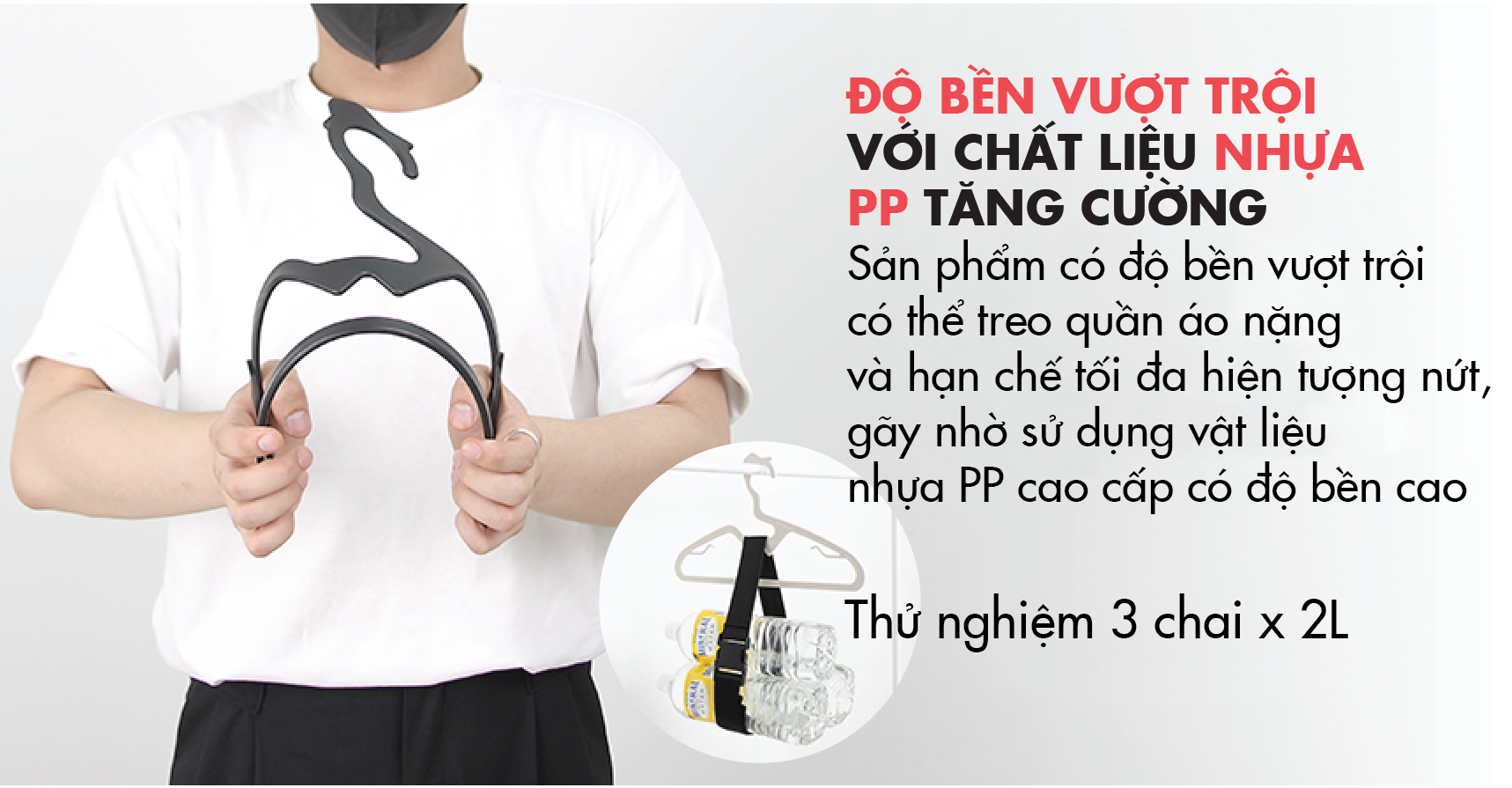 - Sản phẩm có độ bền vượt trội có thể treo quần áo nặng và hạn chế tối đa hiện tượng nứt, gãy nhờ sử dụng vật liệu nhựa PP cao cấp có độ bền cao