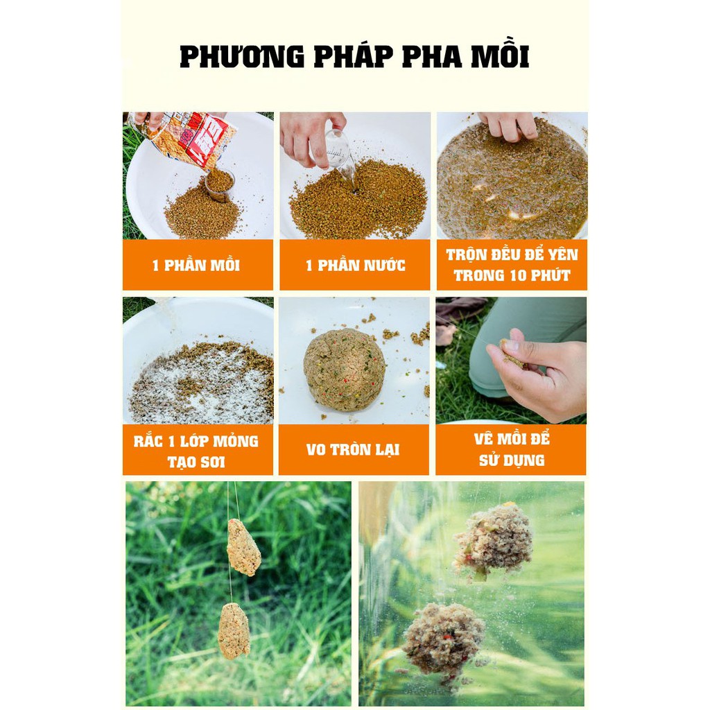 Hướng dẫn sử dụng: Tỉ lệ mồi nước là 1:1 Ngâm mồi với nước từ 5-10 phút cho mồi hút đủ nước là có thể sử dụng