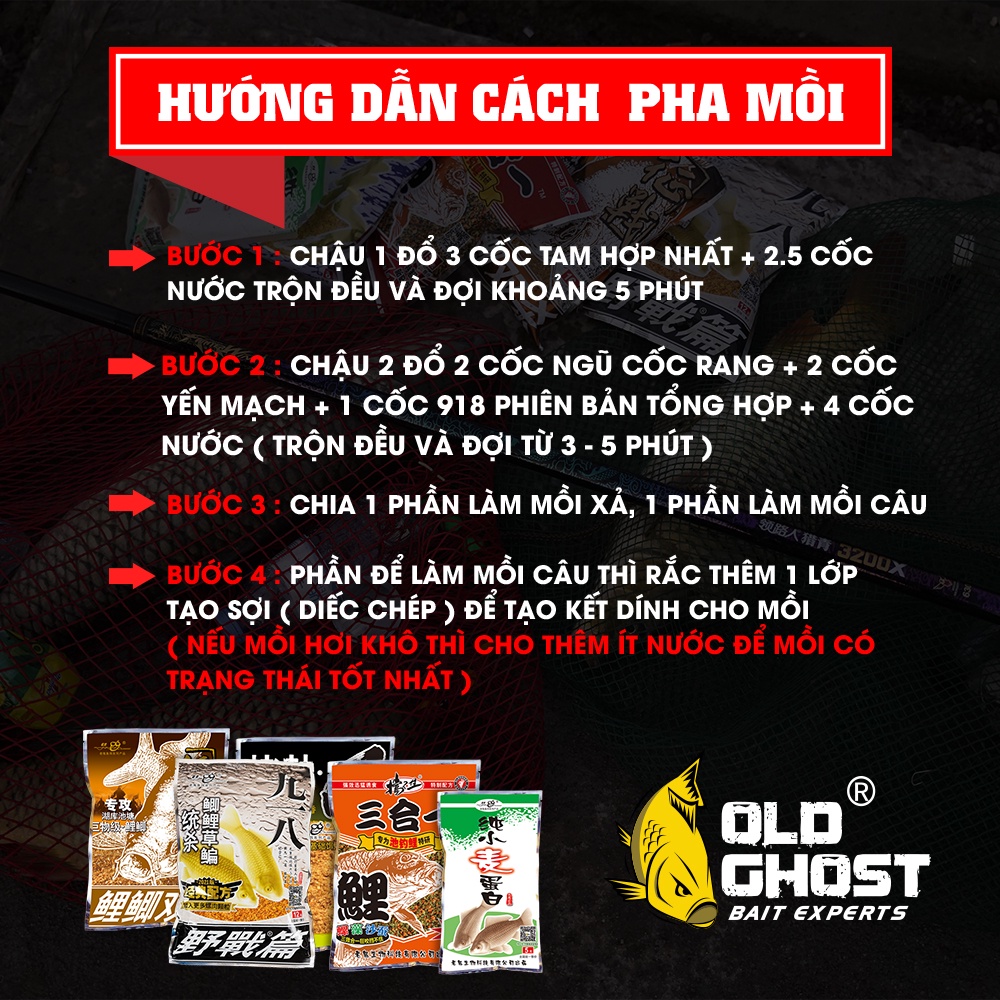 Bước 1: Chậu 1 đổ 3 cốc Tam Hợp Nhất + 2.5 cốc nước trộn đều và đợi khoảng 5 phút Bước 2: Chậu 2 đổ 2 cốc Ngũ Cốc Rang + 2 cốc Yến Mạch + 1 cốc 918 Tổng Hợp + 4 cốc nước trộn đều và đợi từ 3-5 phút Bước 3: Chia 1 phần làm mồi xả, 1 phần làm mồi câu Bước 4: Phần để làm mồi câu thì rắc thêm 1 lớp Tạo Sợi ( Diếc Chép ) để tạo độ kết dính cho mồi