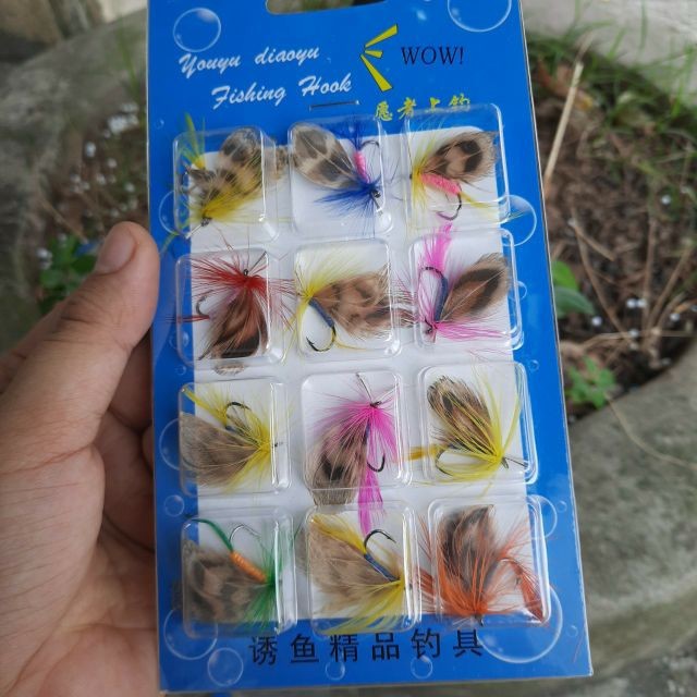 set 12 con mồi lông gắn lông vũ và cánh bướm siêu đẹp dài 7mm lưỡi hook