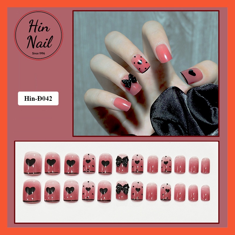 Giới thiệu móng tay giả đính nơ đen ngắn Hin Nail form ngắn họa tiết trái tim