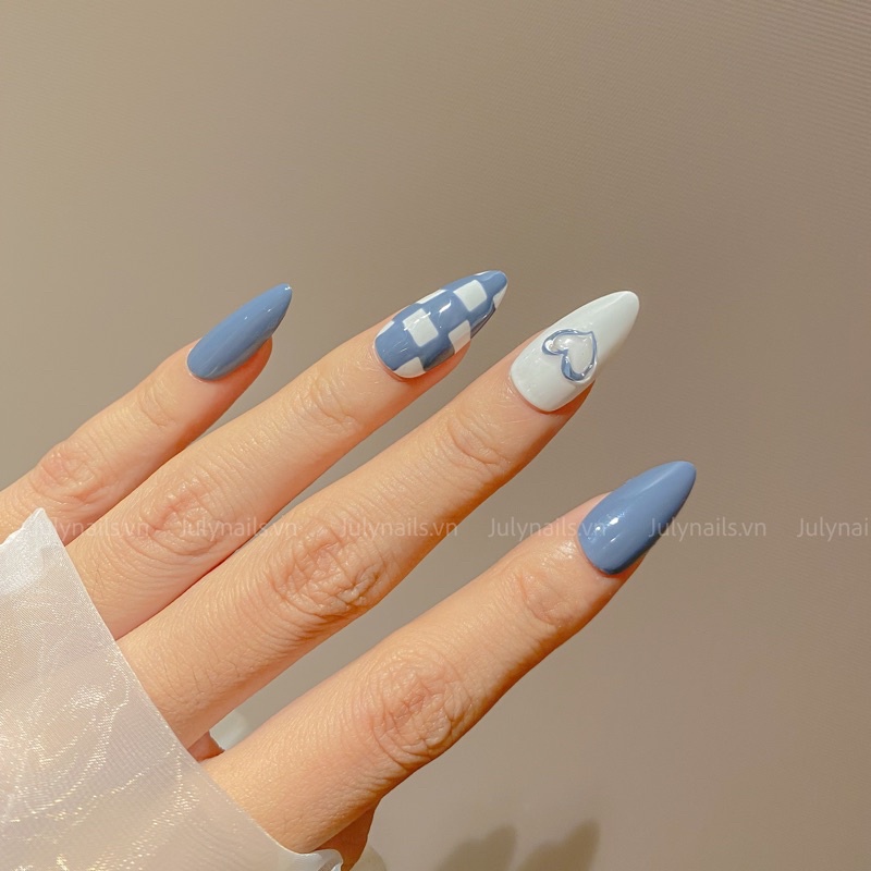 Giới thiệu Móng Úp Thiết Kế Màu Xanh Caro Trắng Dễ Thương Tròn Nhọn Dài julynails.vn nb121
