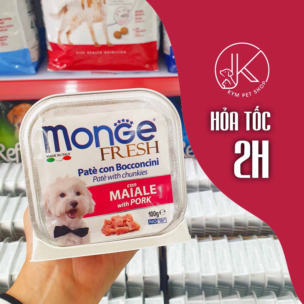 MONGE – Pate cho chó hộp 100g ĐỐI TƯỢNG: Mọi loại chó và mọi lứa tuổi TRỌNG LƯỢNG: 100g XUẤT XỨ: Nước Ý GIỚI THIỆU: Pate Monge cho chó được sản xuất bởi thương hiệu Monge, một trong những thương hiệu thực phẩm cho thú cưng hàng đầu nước Ý nói riêng và châu Âu nói chung. Với sự mệnh mang đến sự chăm sóc toàn diện cho sức khỏe thú cưng, từng sản phẩm của Monge đều được chăm chút kỹ lưỡng từ khâu nguyên liệu, sản xuất cho đến kiểm tra an toàn thực phẩm. Từ khi được thành lập từ năm 1963 với thức ăn ướt cho vật nuôi, Monge luôn đặt tiêu chí sức khỏe thú cưng làm trọng điểm của sự phát triển. Đến năm 2013, Monge mới bắt đầu bước chân vào phát triển dòng thức ăn khô. Tất cả các sản phẩm thức ăn đều đạt đến tầm cao chất lượng và tiêu chuẩn dinh dưỡng vượt trội. Thương hiệu Monge từ Ý có hơn 57 kinh nghiệm trong ngành sản xuất thức ăn ướt cho cún cưng. Các sản phẩm của họ đều nhận được sự công nhận mạnh mẽ trên toàn Châu Âu. Do vậy, bạn có thể hoàn toàn yên tâm đặt niềm tin vào chất lượng và độ an toàn của sản phẩm pate Monge cho chó. THÀNH PHẦN: Nguồn thực phẩm chính cho chó chính là thịt. Thành phần thịt trong pate Monge chiếm hàm lượng tương đối cao. Nhờ vậy, chúng ta có thể tin tưởng rằng sản phẩm mang đến nguồn thức ăn đáp ứng được nhu cầu protein và năng lượng hoạt động trong ngày. Nhờ đó, chó có thể phát triển cơ bắp, sinh trưởng phát triển ổn định. Hơn nữa, có thể nhận thấy rằng, Monge đã rất khôn khéo trong khâu chọn nguyên liệu. Tất cả các loại thịt đều được lấy từ thịt gia cầm, gia súc, hải sản chất lượng cao. Theo các chuyên gia dinh dưỡng, đây chính là một trong những loại thịt bổ dưỡng nhất. Ngoài protein, chất béo, khoáng chất chiếm hàm lượng cao nhất, thịt gia súc, gia cầm, hải sản còn giàu vitamin và khoáng chất khác như selen, kẽm, vitamin B, B6, riboflavin, vitamin A, … Loại protein chất lượng cao này mang đến một chế độ dinh dưỡng hoàn thiện. Giúp bạn chăm sóc tuyệt đối cho da, lông và móng của chó. Củng cố sự khỏe mạnh làn da, nuôi dưỡng lông bóng mượt hoàn hảo. ƯU ĐIỂM: • Pate không chứa tinh bột. Mang đến nguồn dinh dưỡng tập trung, cần thiết tức thời. Chó có thể hấp thụ dễ dàng, năng lượng được cung cấp nhanh chóng. Hoạt động, sinh trưởng, phát triển khỏe mạnh. • Thức ăn có kết cấu mềm, dễ nhai, hương vị đặc biệt. Vô cùng thu hút và kích thích vị giác. Giúp chó ăn uống nhiều hơn, kể cả những bé chó biếng ăn nhất. • Thích hợp với mọi độ tuổi của chó. Bổ sung năng lượng tức thì, hiệu quả. Mang đến một cơ thể tràn trề sinh lực. Chó con lớn nhanh hơn, chó bệnh mau khỏi bệnh hơn và hơn hết giúp chó già có một chế độ ăn hoàn hảo nhất, duy trì sự sống. • Có sự kết hợp độc đáo với rau củ, đặc biệt là trái cây. Mang đến một chế độ dinh dưỡng toàn diện và lành mạnh nhất cho chó cưng của bạn. • Đa dạng hương vị, mang đến những bữa ăn ngon miệng cho cún cưng. Các vị thức ăn phổ biến gồm: Pate gà và rau, Gà tây và táo, Gà và mâm xôi, Vịt và cam,…