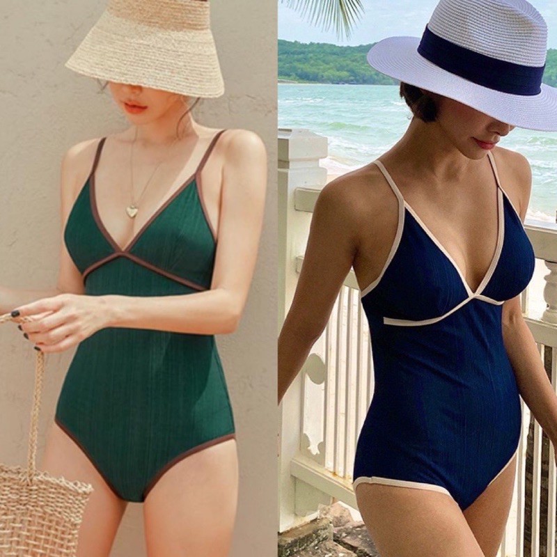 Giới thiệu Monokini bikini liền mảnh cúp ngực viền dây màu xanh than/ xanh lá