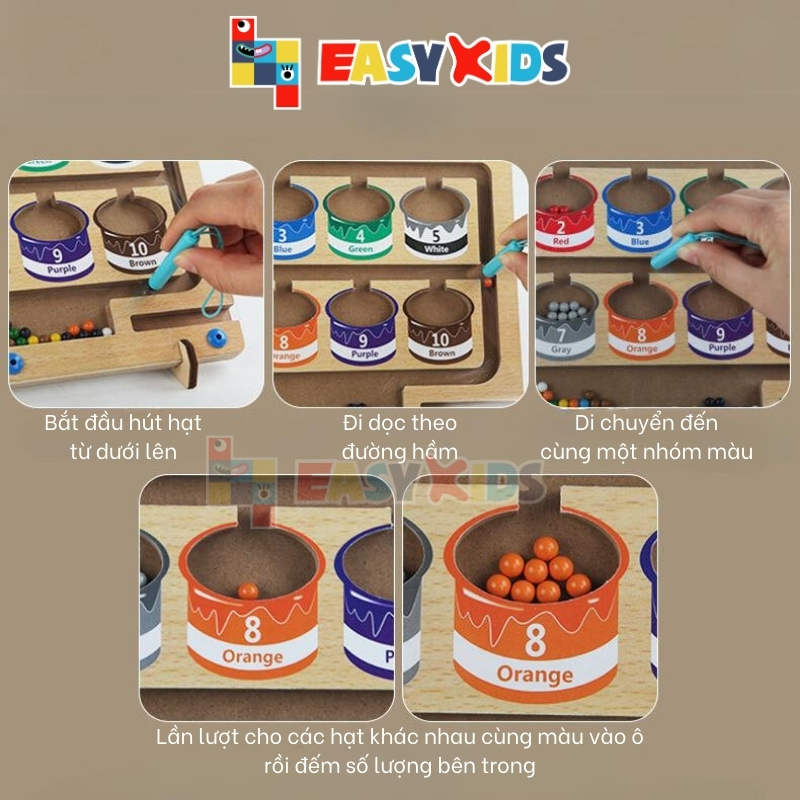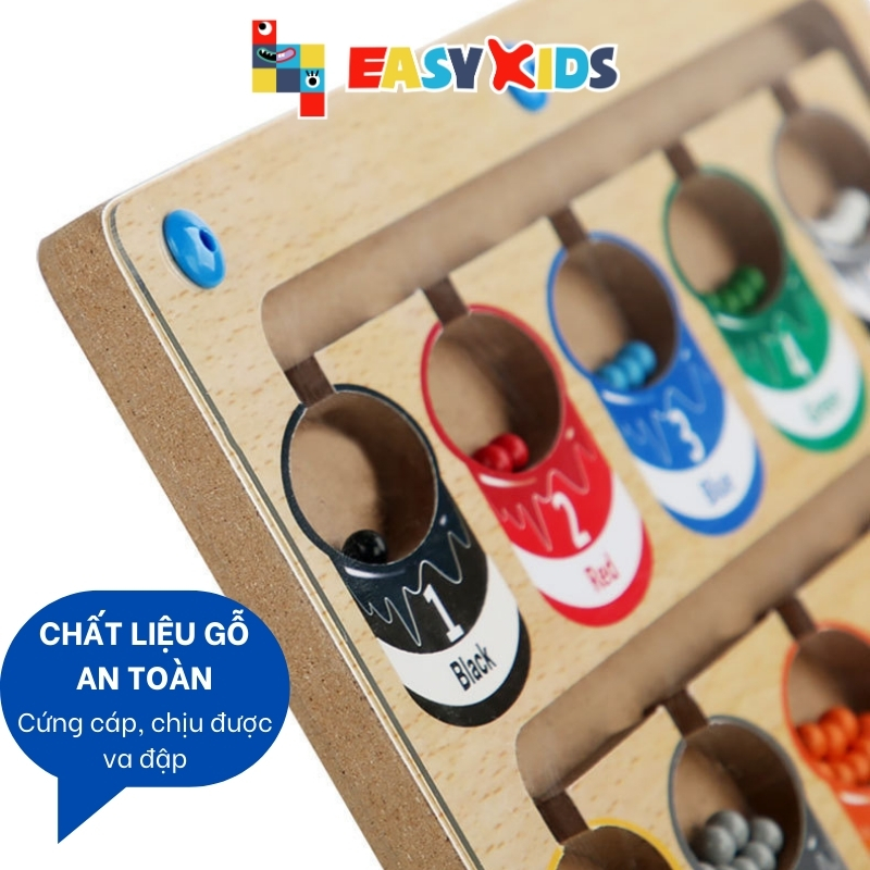 Bảng hút nam châm Montessori không chỉ giúp bé phân biệt màu sắc và số đếm, mà còn tăng cường khả năng vận động tay mắt và tư duy logic. Bé sẽ hứng thú với việc tìm và ghép đúng các ô màu sắc và bi màu vào bảng. Đồng thời, sản phẩm còn giúp bé học cách sắp xếp, phân loại và tạo thành các chuỗi màu sắc.