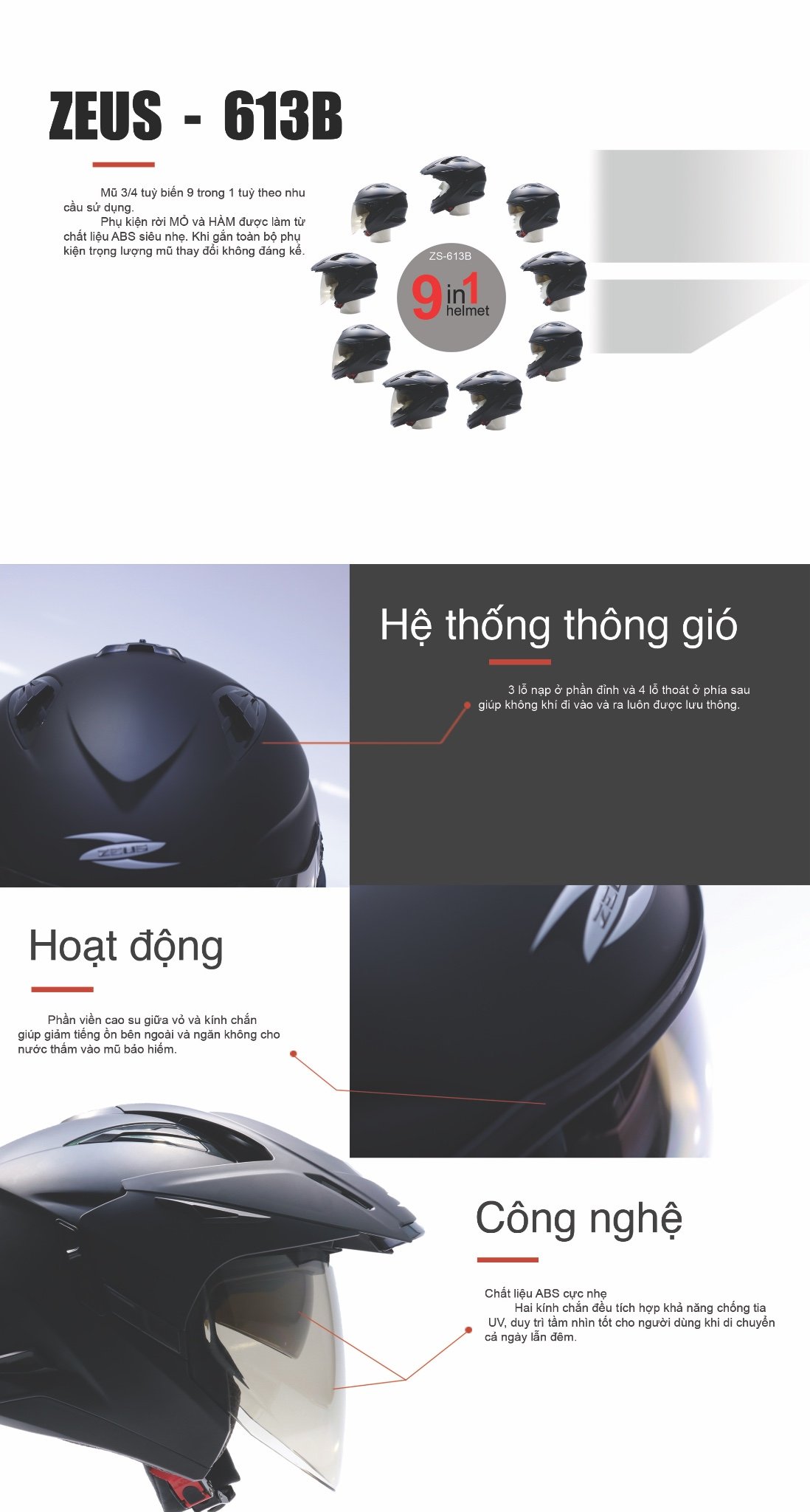 Zeus 613B là dòng mũ đa năng 9 trong 1, có thể biến hóa đa dạng, người sử dụng có thể lựa chọn mua thêm lưỡi nón và hàm mũ. Thân mũ được thiết kế nhỏ gọn, tinh tế bằng chất liệu nhựa ABS nguyên sinh, không hề đem lại cảm giác nặng nề khi sử dụng trên chặng đường dài.
