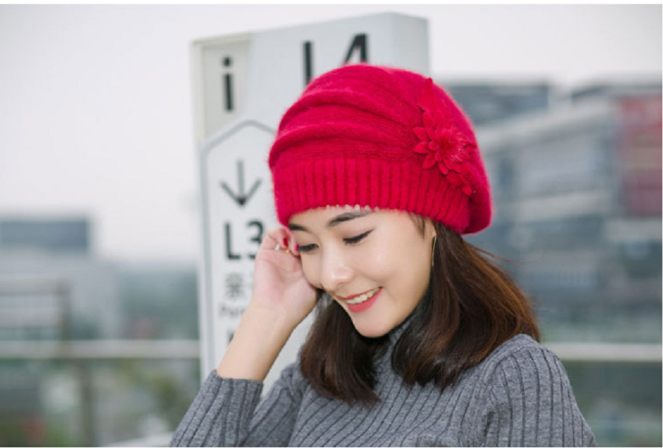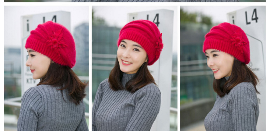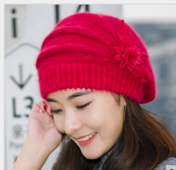 Mũ len nữ lông thỏ gắn hoa đơn phong cách Hàn Màu đỏ