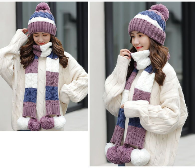 Bộ mũ len quả bông kèm khăn và găng tay cao cấp mới, sét nón len cho nữ thời trang
