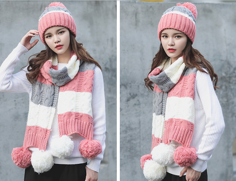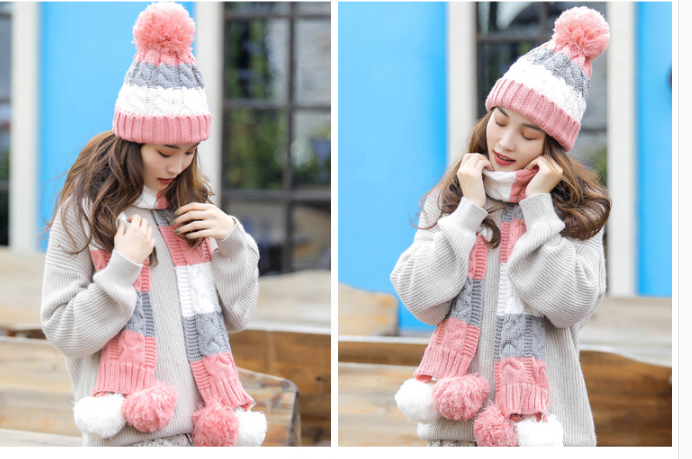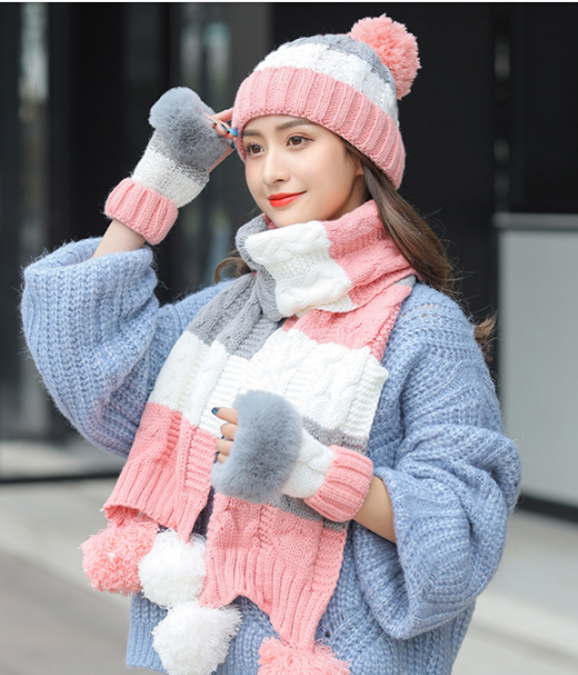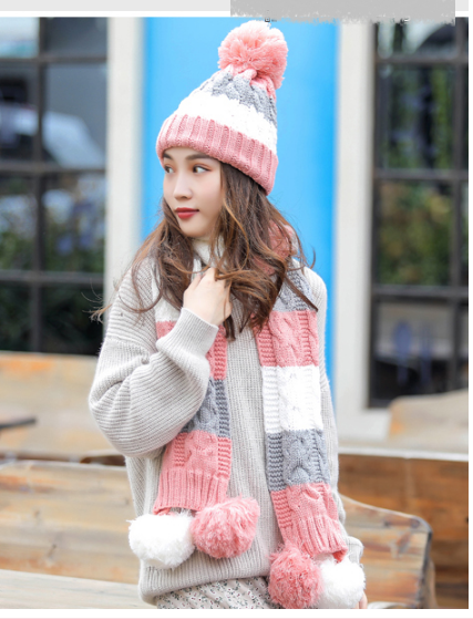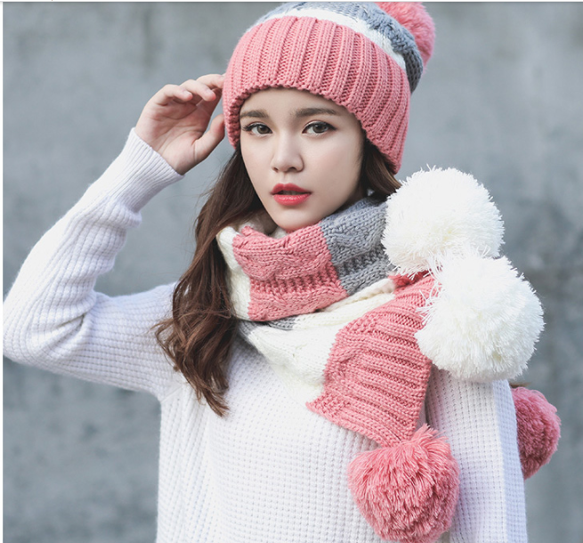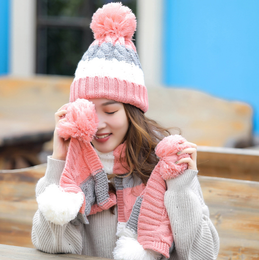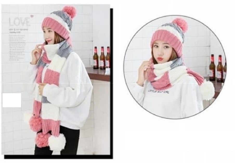Bộ mũ len quả bông kèm khăn và găng tay lót nỉ phong cách Hàn, sét nón len cho nữ cao cấp