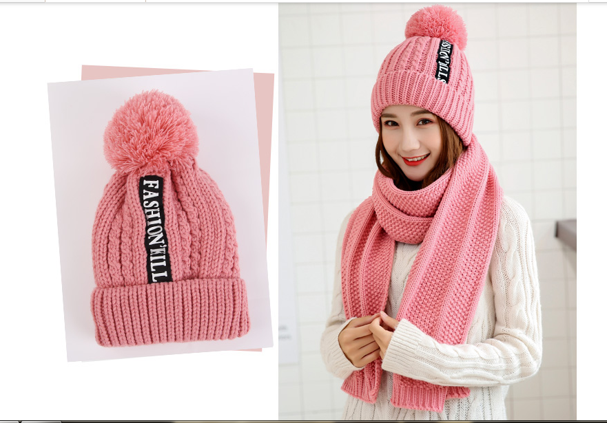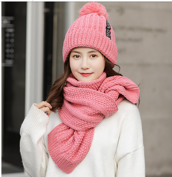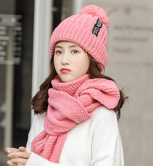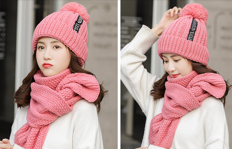 Bộ mũ len nữ kèm khăn màu hồng phấn mũ nón len nữ thời trang mới
