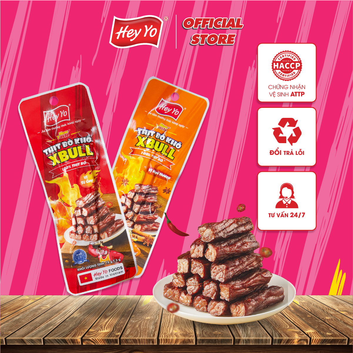 Thịt bò khô Xbull là dòng sản phẩm mới đến từ thương hiệu Hey Yo Foods chuẩn hương vị độc đáo, ngon chuẩn vị. Với 2 hương vị: Ngũ vị hương và Tê cay được làm theo công thức độc quyền đem đến những miếng thịt bò thơm, mềm, ẩm mượt, ngọt thịt, dai ngon vừa ý.