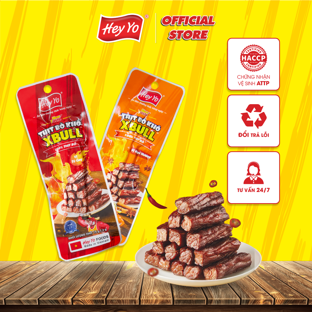 Thịt bò khô Xbull là dòng sản phẩm mới đến từ thương hiệu Hey Yo Foods chuẩn hương vị độc đáo, ngon chuẩn vị. Với 2 hương vị: Ngũ vị hương và Tê cay được làm theo công thức độc quyền đem đến những miếng thịt bò thơm, mềm, ẩm mượt, ngọt thịt, dai ngon vừa ý.