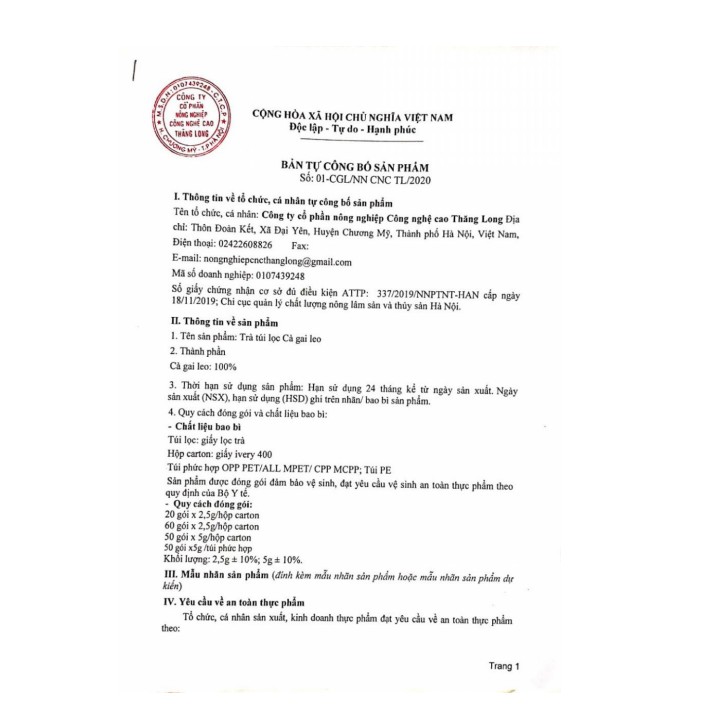 *(Mua 2 bịch cà gai leo 1kg, tặng 1 hộp trà túi lọc 50g)* ☘️ Công dụng: – Giúp tăng cường chức năng gan trong các trường hợp suy giảm chức năng gan do viê.m gan, x.ơ gan, men gan cao, uống nhiều bia rượu. – Giúp tăng cường chức năng giả.i đ.ộc gan, bảo vệ tế bào gan. ☘️ Đối tượng sử dụng: – Người có chức năng gan suy giảm do v.iêm gan, x.ơ gan, men gan cao, gan nhiễm mỡ, – Người uống bia rượu nhiều.. _ Người hay thức khuya _ Người hay dùng thuốc kháng sinh _ Người ăn uống khó tiêu, hay đầy bụng,... ☘️Hướng dẫn sử dụng – Cho 1 gói trà túi lọc cà gai leo vào cốc. Rót 200ml nước nóng (80- 100 độ C), ngâm gói trà trong 5 – 10 phút rồi nhấc lên 1 – 2 lần là uống được. – Người có chức năng gan suy giảm do v.iêm gan, xơ gan, men gan cao 5 – 6 gói/ ngày – Người uống bia rượu nhiều 3-4 gói/ngày. - Sản phẩm của Công ty CP NN công nghệ cao Thăng Long - HSD: 24 tháng kể từ ngày sản xuất Lưu ý : Uống trà khi còn nóng ấm là ngon nhất . KHÔNG SỬ DỤNG CHO PHỤ NỮ CÓ THAI VÀ TRẺ DƯỚI 6 TUỔI