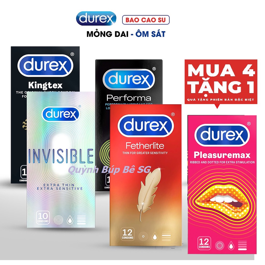 ❖ CHI TIẾT SẢN PHẨM: COMBO 4 HỘP: INVISIBLE + PERFORMA + KINGTEX + FETHERLITE - TẶNG BCS Durex Pleasure Max Gân Gai Hộp 12 Cái • Nhãn hiệu : Durex • Độ dài : 18cm • Xuất xứ : Thái Lan • Hạn sử dụng : 3 năm • Quy cách: Hộp 10 và 12 cái • Đối tượng sử dụng : Nam • 5 Hộp • Tiêu chuẩn sản xuất: ISO 4074:2002 • Bảo quản: Để ở nơi khô mát, tránh ánh nắng trực tiếp.
