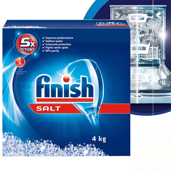 Muối rửa chén Finish Dishwasher Salt giúp làm mềm nước trong máy rửa chén của bạn. Nước máy thông thường chứa nhiều canxi, magie sẽ gây lên sự tích tụ cặn vôi trong máy rửa chén, đồng thời làm giảm tính năng của viên rửa chén, gây tắc vòi phun nước, ống dẫn và đặc biệt tạo ra các mảng bám trên chén đĩa, các đồ sành sứ, thủy tinh, inox và các dụng cụ nhà bếp của bạn.