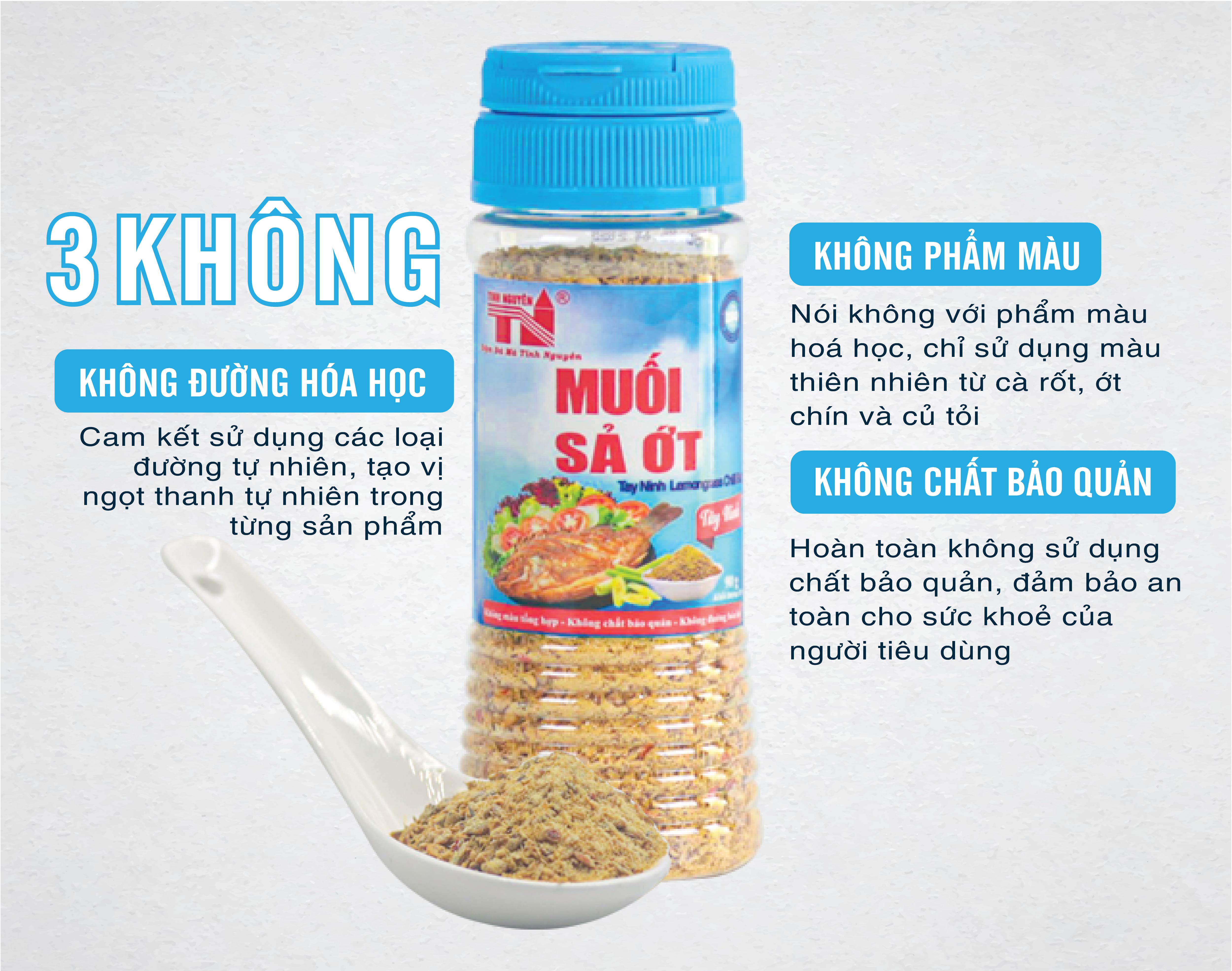 Sự hoà quyện đến từ trái ớt chín mọng và các nguyên liệu được phối trộn với một tỷ lệ nhất định, đem đến hương vị thơm nồng nhưng vẫn đảm bảo sức khoẻ và an toàn. Muối Sả Ớt Tinh Nguyên được sản xuất với một quy trình nghiêm ngặt và máy móc hiện đại, đảm bảo an toàn vệ sinh thực phẩm theo tiêu chuẩn ISO 9001:2015 và ISO 9001:22000.