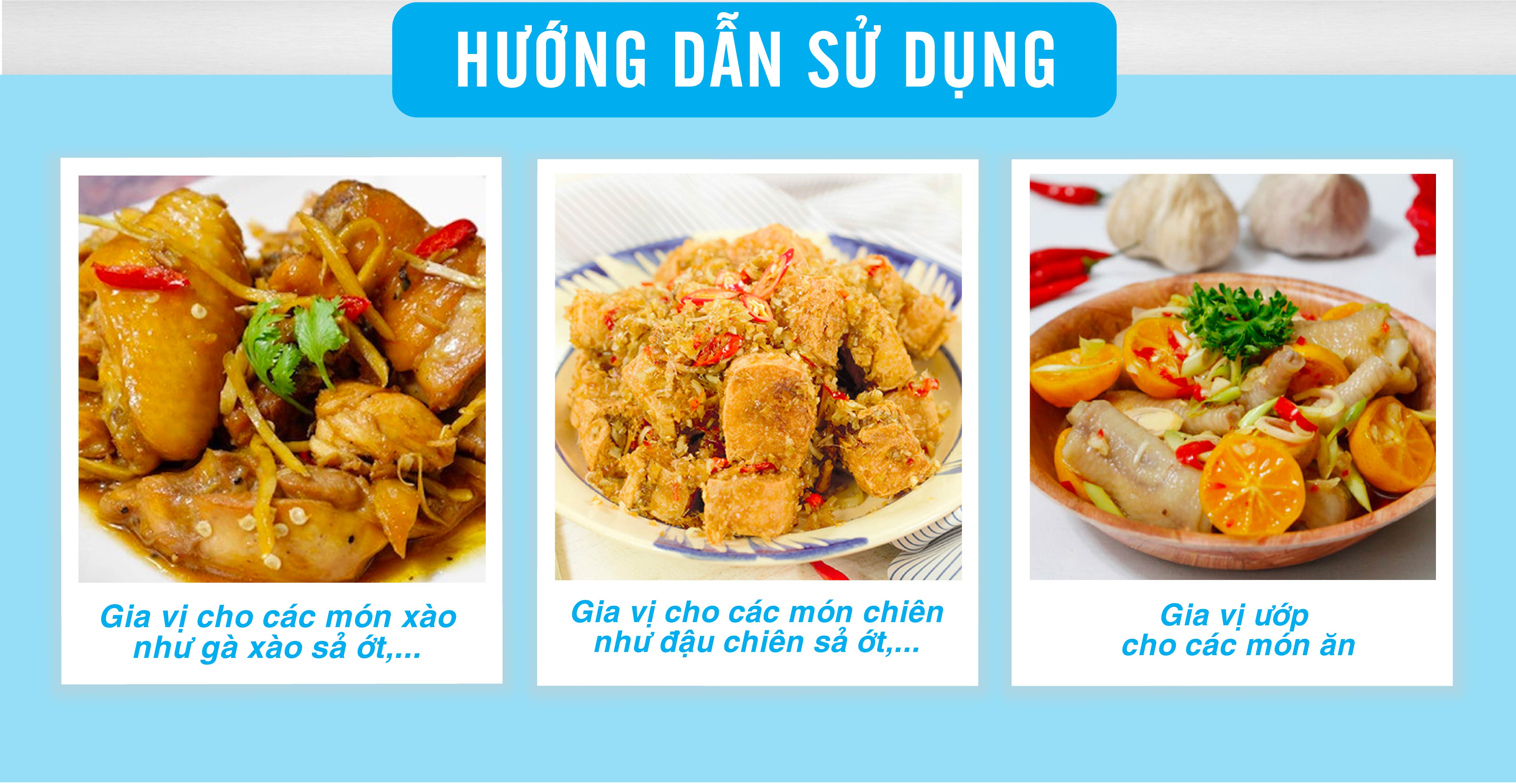 Hướng dẫn sử dụng | - Gia vị nêm nếm và tẩm ướp thức ăn.- Ngon hơn khi sử dụng với các món chiên sả ớt hoặc kho sả ớt. |