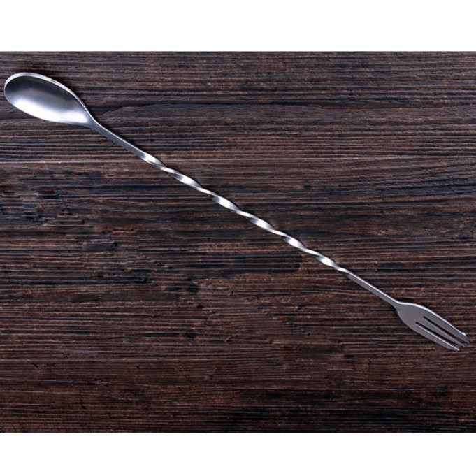 - Dụng cụ được làm bằng chất liệu inox nên rất chắc chắn và bền. Một đầu có dạng thìa dùng để khuấy cocktail, một đầu có thanh nhọn dùng để ghim trái cây.