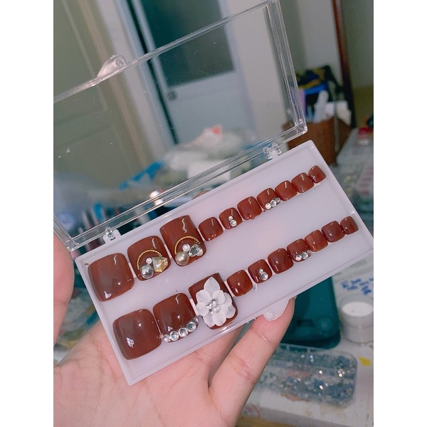 Giới thiệu Nailbox/ Bộ 24 móng úp chân sẵn/ Móng chân giả màu cam đất đính đá khối đắp hoa