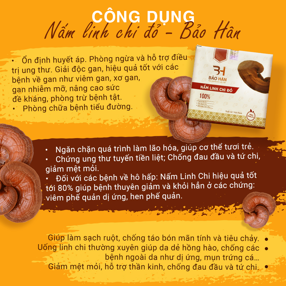 Nấm linh chi đỏ Việt Nam rất tốt cho việc ngăn chặn quá trình lão hóa. Phụ nữ dùng da dẻ sẽ hồng hào và tươi trẻ, kéo dài tuổi thọ. Dùng thường xuyên giúp giảm stress, an thần, mang lại cảm giác ăn ngon, ngủ sâu. Hỗ trợ chữa bệnh tiểu đường.