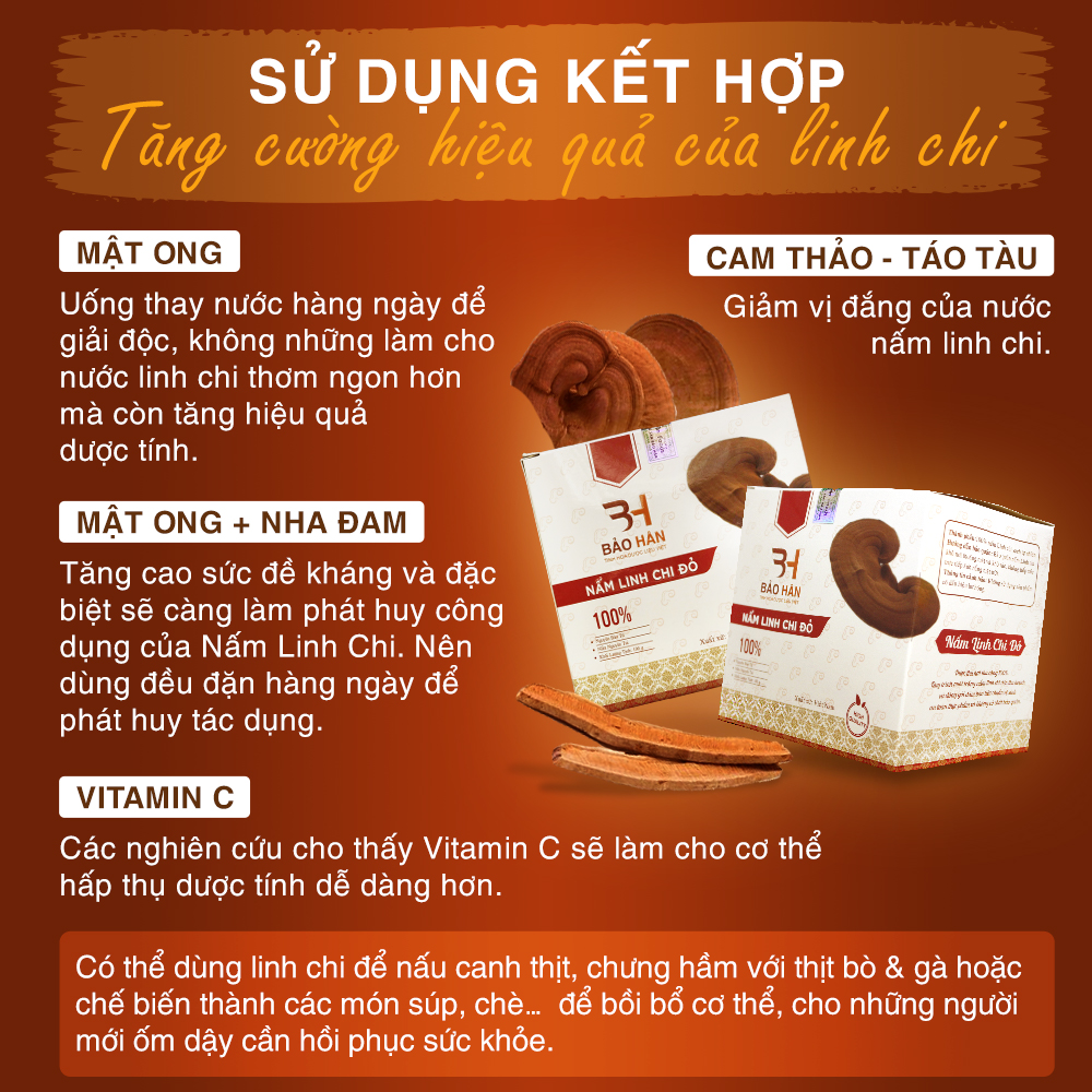 Hướng dẫn sử dụng | Để bảo toàn dược chất và phát huy tối đa công dụng, bạn cần sử dụng nấm Linh Chi đúng cách. Một số cách thông dụng có thể sử dụng ngay sau đây:DẠNG THUỐC:Mỗi ngày dùng 15-30g nấm khô. Làm ướt nấm trước khi nấu bằng nước khoảng 20 phút. Thêm 600ml nước, đun sôi nhẹ trong 30-40 phút. Gạn lấy nước 1. Cho thêm tiếp 600ml nước vào và tiếp tục đun sôi như lần 1 để lấy nước 2. Lần 3 cũng làm giống lần 1 và 2 để lấy nước 3. Nước của các lần nấu được hòa chung với nhau, uống nóng hoặc lạnh đều được. Có thể bảo quản tủ lạnh nếu không uống hết.NẤU CANH:Mỗi ngày 5-10g nấu lấy nước để nấu canh, có thể thái lát nhỏ hoặc tán thành bột dùng đều được.TRÀ LINH CHI:Mỗi ngày dùng 5-7g nấm khô (6-8 lát) pha (hãm) với 0,5 lít nước sôi trong bình giữ nhiệt từ 10-15 phút. Có thể pha thêm nhiều lần nước sôi đến khi không còn màu của nước nấm nữa. |