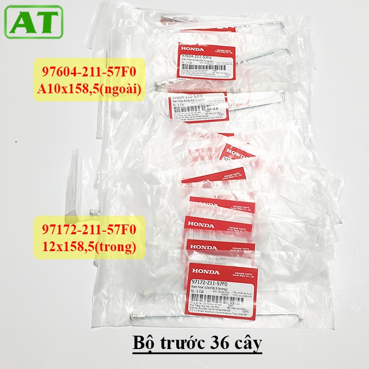 Thông tin sản phẩm: - Tên sản phẩm: Nan hoa trước sau Dream Wave 100 - Bộ bánh trước 36 cây: có 18 cây nan hoa ngoài A10x158.5 mã 97604-211-57F0 và 18 cây nan hoa trong 12x158.5 mã 97172-211-57F0 - Bộ bánh sau 36 cây: có 18 cây nan hoa ngoài A10x156.5 mã 97602-411-53P0 và 18 cây nan hoa trong A10x157 mã 97282-411-54P0 - Mỗi cây nan hoa đóng riêng 1 túi nilon - Bộ trước lắp cho Vành xe 1.20 – 17, bộ sau lắp cho Vành 1.40 – 17 - Sản phẩm chính hãng công ty Honda Việt Nam