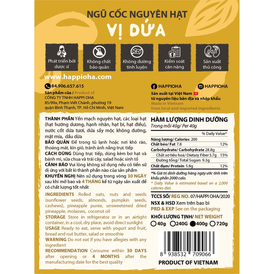 - Thành phần: Yến mạch, hạnh nhân, hạt điều, hạt bí, hạt hướng dương, nước cốt dứa tươi, dứa sấy mộc không đường, mật mía, dầu dừa. - Vị ngọt nhẹ, thơm mùi dứa. - Sản phẩm: CÔNG TY TNHH HAPPI OHA