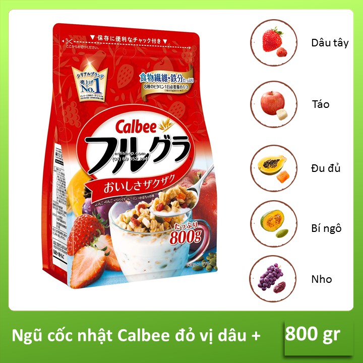 Ngũ cốc hoa quả giảm cân Calbee Nhật Bản Là một loại ngũ cốc Nhật Bản giàu chất dinh dưỡng, chứa nhiều loại trái cây và hạt được sấy khô gồm yến mạch, lúa mạch, táo, nho, đu đủ, dâu tây, dừa, ngô, bí ngô, hạnh nhân, gạo nâu, sữa….