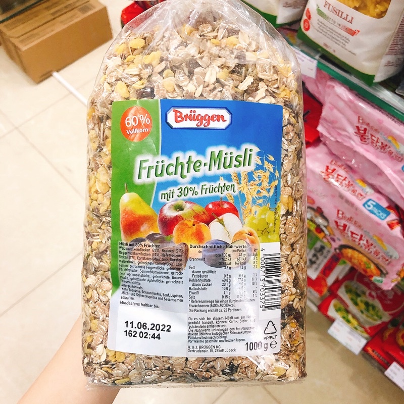 Thành phần: Yến mạch cán, lúa mì cán, sầu riêng, cám yến mạch, đu đủ khô thái hạt lựu, mảnh đậu lupine, hạt lanh, chà là khô, hạt hướng dương, mơ khô, hạt hạnh nhân, kiều mạch.