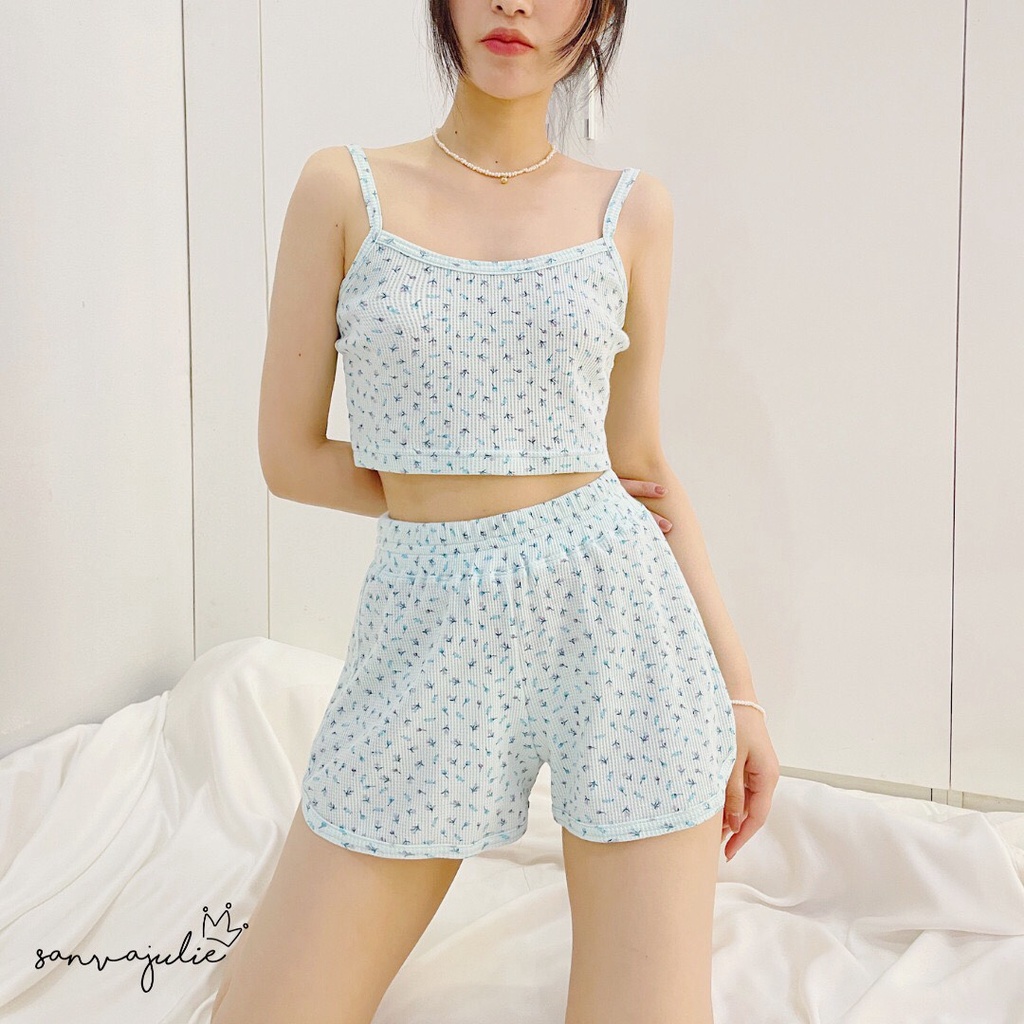 Bộ đồ ngủ, đồ tập áo 2 dây croptop - quần sooc - Hoa oải hương - thiết kế Sanvajulie