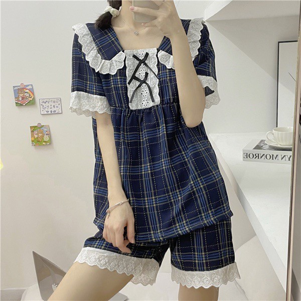 Giới thiệu Bộ ngủ kẻ caro phối ren siêu cute Ulzzang style Hàng Quảng Châu