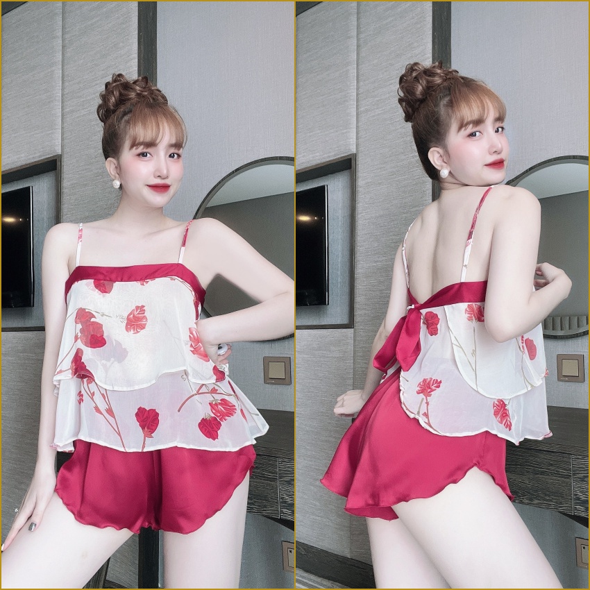 Giới thiệu Bộ ngủ lụa 2 dây sexy TUTA ngực phối ren quần đùi lụa satin gợi cảm thoáng mát - dn030