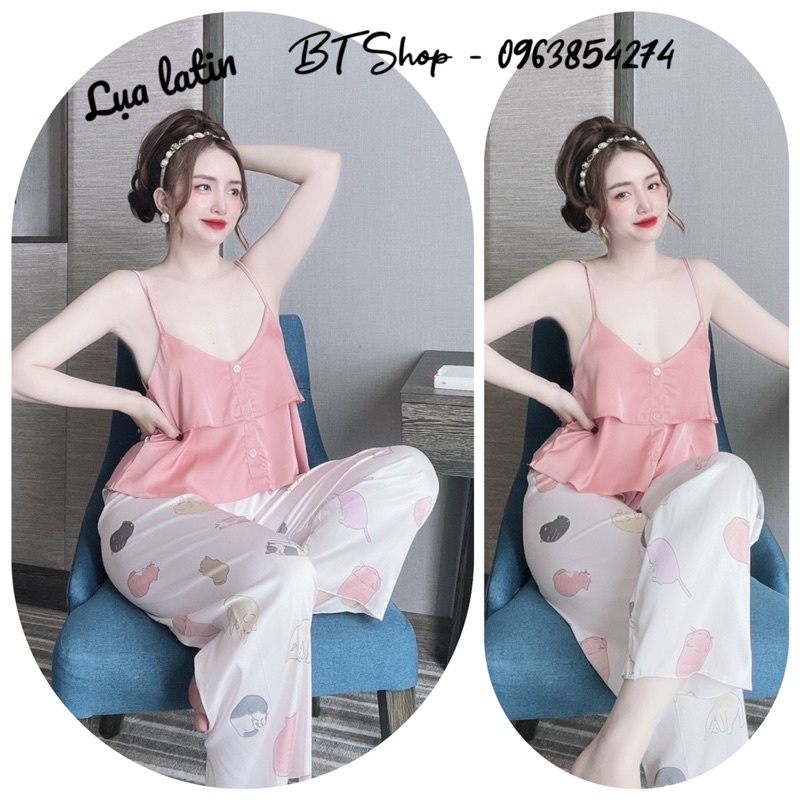 👉🏻 Chất liệu: lụa latin mềm mịn, vải trơn, sờ mát rất sướng tay 👉🏻 Thiết kế: áo 2 dây có tăng đơ, áo gắn 4 nút, quần dài hoạ tiết dễ thương. 👉🏻 Màu sắc: 6 màu (hình mẫu mặc có thể đậm hoặc nhạt hơn so với sản phẩm ạ) 👉🏻 Freesize từ 42-57kg 🔔 Sỉ từ 10 bộ bất kỳ (0963854274)