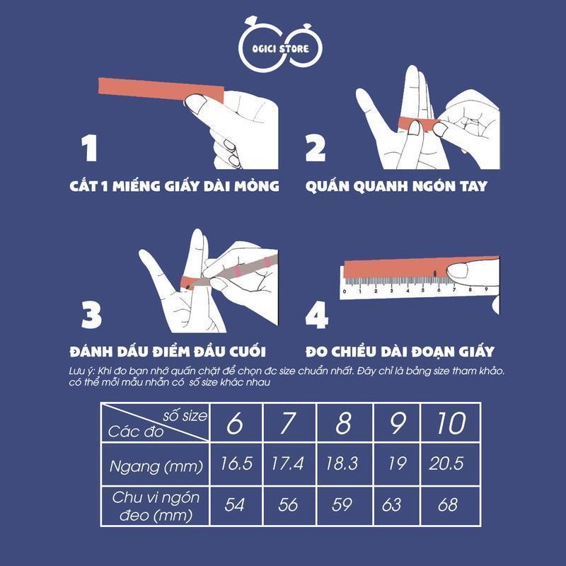 Kích thước: (Số 7 Chu vi bên trong 56 mm) - (Số 8 Chu vi bên trong 59 mm) - (Số 9 Chu vi bên trong 63 mm) - (Số 10 Chu vi bên trong 68 mm)