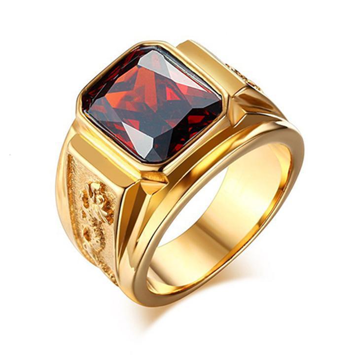 Nhẫn nam titan cao cấp thời trang kiểu chạm rồng 2 bên trangsucpt đá đỏ nhẫn màu mạ vàng thép không gỉ PTNNA255