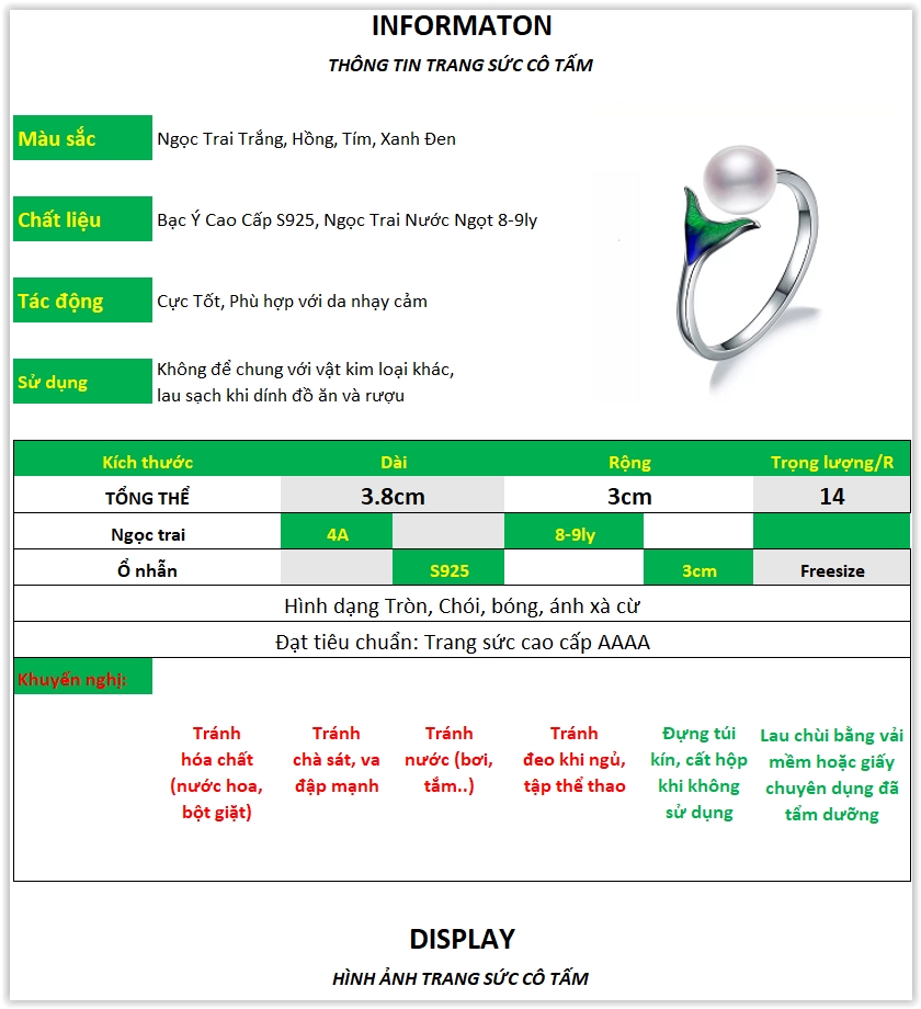 | Kích thước | Hạt ngọc 8-9lyKích thước nhẫn 3.8*3cm |