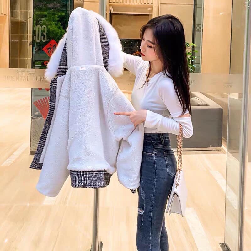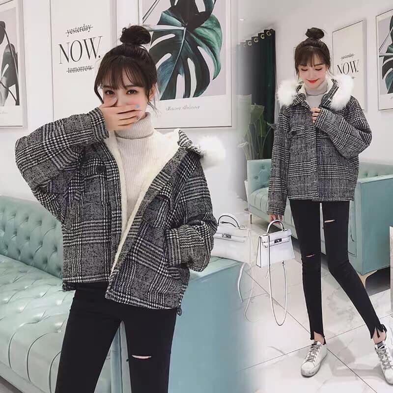 Áo Khoác dạ kẻ lót lông, mũ lông siêu dày dặn