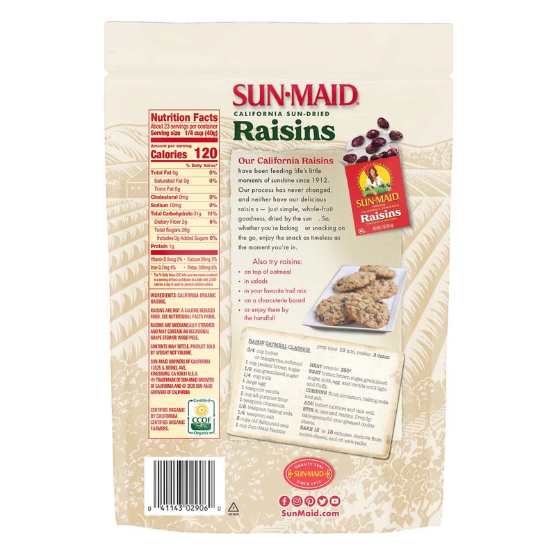 Những trái nho khô đã kiểm định chất lượng gắt gao từ California với thành phần 100% giống nho tươi không hạt Thompson được chăm sóc từ những thợ vườn có chứng chỉ trồng thực phẩm hữu cơ của Sun- Maid.