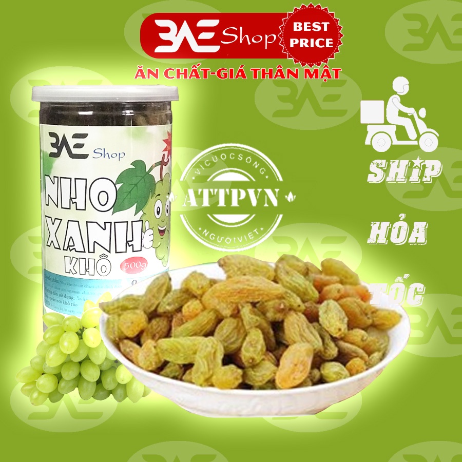Nho khô xanh Ninh Thuận sấy dẻo không hạt loại hộp 500g shop 3AE đồ ăn vặt Hà Nội ngon bổ rẻ