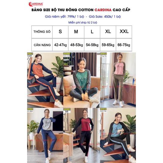 𝗧𝗵𝗼̂𝗻𝗴 𝗧𝗶𝗻 𝗦𝗮̉𝗻 𝗣𝗵𝗮̂̉𝗺: Bộ Thu Đông Nữ 𝐂𝐀𝐑𝐃𝐈𝐍𝐀 Chất Cotton Cao Cấp ➤Thương hiệu: 𝐂𝐀𝐑𝐃𝐈𝐍𝐀. ➤ Màu sắc: 6 màu ➤ Chất liệu:Cotton ➤ Sản Phẩm Bao Gồm: 1 áo + 1 quần + 1 túi đựng sản phẩm. ➤Thông số size: S, M, L, XL, XXL ➤ Thời trang theo phong cách Nhật Bản hiện đại. ---------------------------------