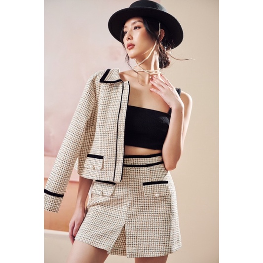 Set dạ tweed gồm áo dạ tweed và chân váy dạ tweed, bên trong có lót lụa. Áo dạ và chân váy có bán riêng.