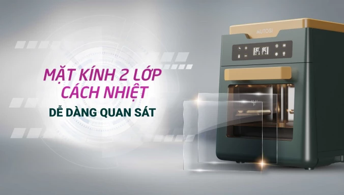 Mặt kính 2 lớp trong suốt, cách nhiệt, dày dặn, bền bỉ, dễ dàng quan sát thực phẩm bên trong và xác định thời gian để món ăn được ngon và bắt mắt nhất.