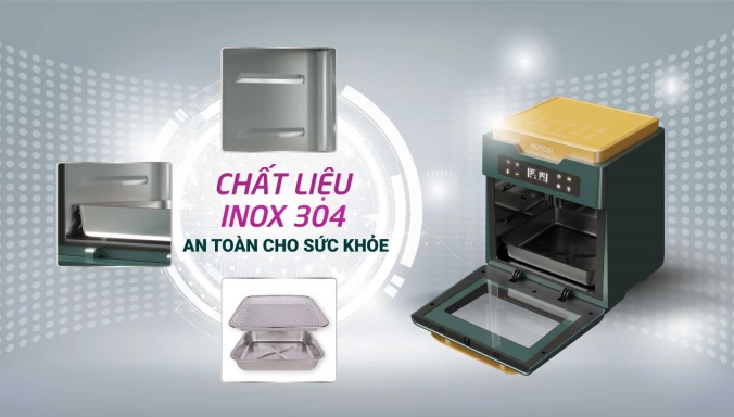 Khoang nướng và các phụ kiện tiếp xúc trực tiếp với thực phẩm được làm hoàn toàn bằng Inox 304 cao cấp, bền bỉ, an toàn tuyệt đối với sức khỏe.
